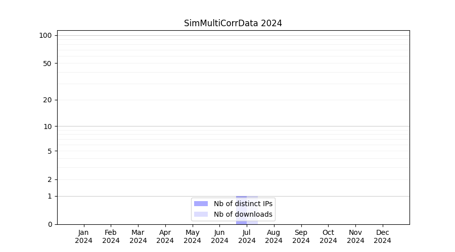 Number of downloads for annotation package SimMultiCorrData, year by year, from 2025 back to 2014 (years with no downloads are omitted):