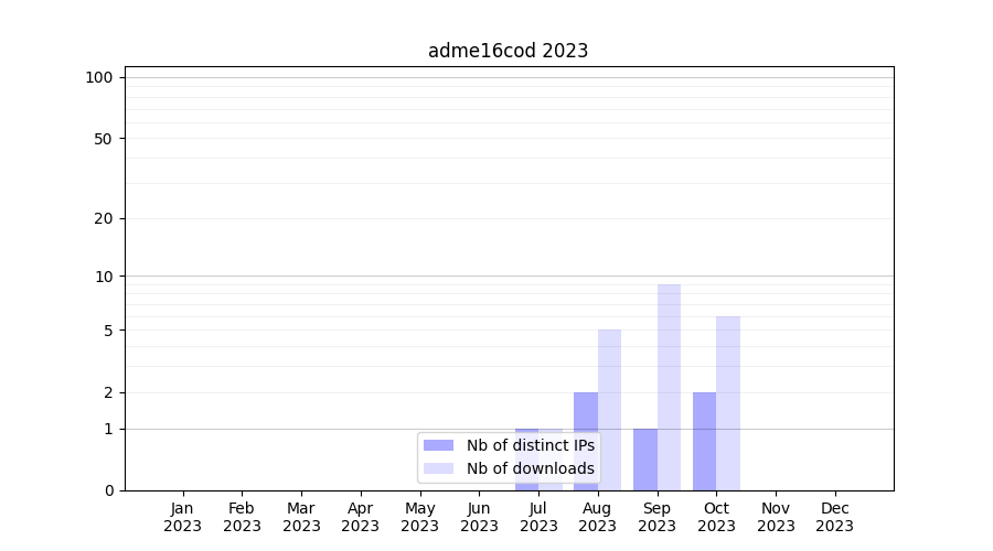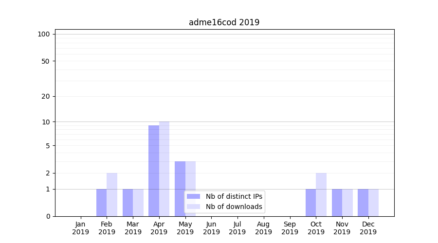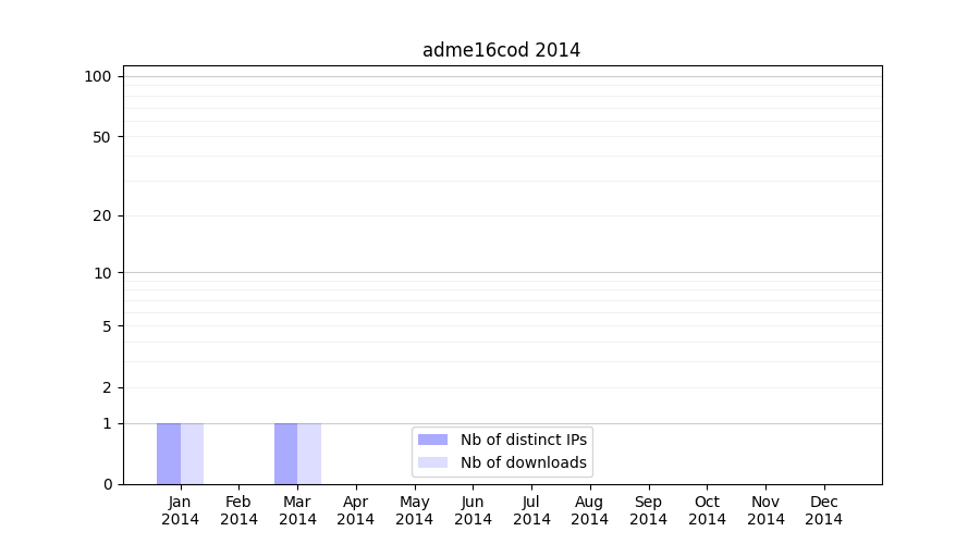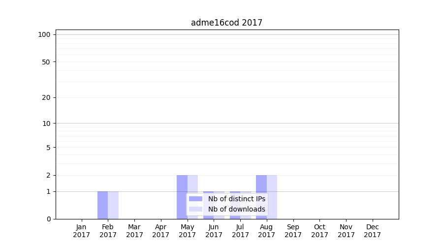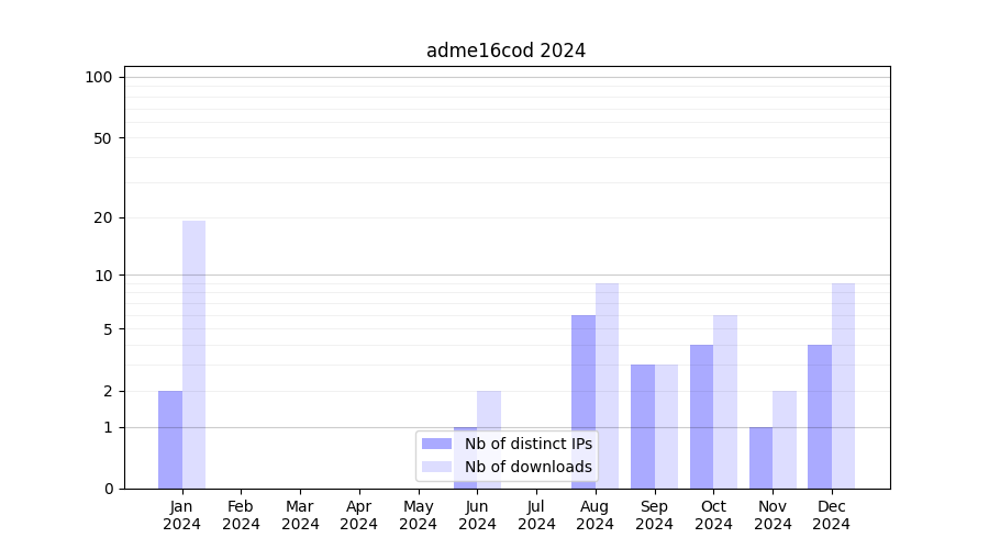 Number of downloads for annotation package adme16cod, year by year, from 2025 back to 2014 (years with no downloads are omitted):