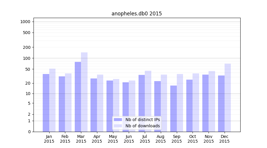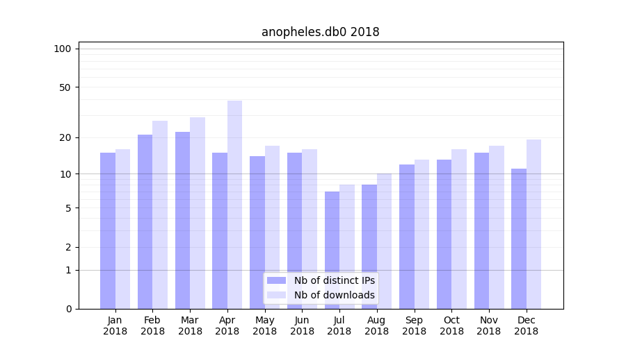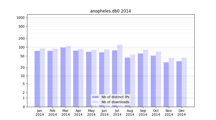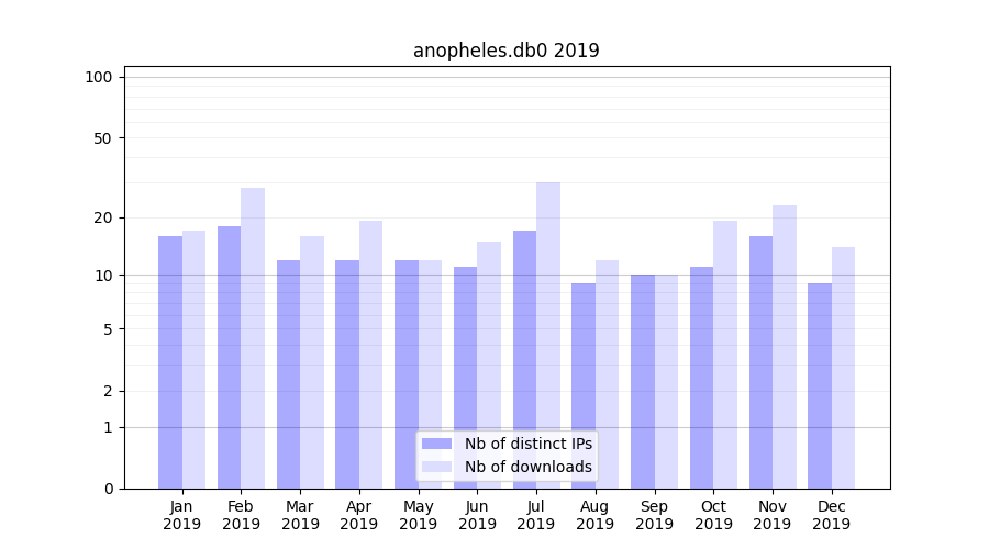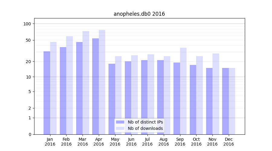 Number of downloads for annotation package anopheles.db0, year by year, from 2025 back to 2014 (years with no downloads are omitted):