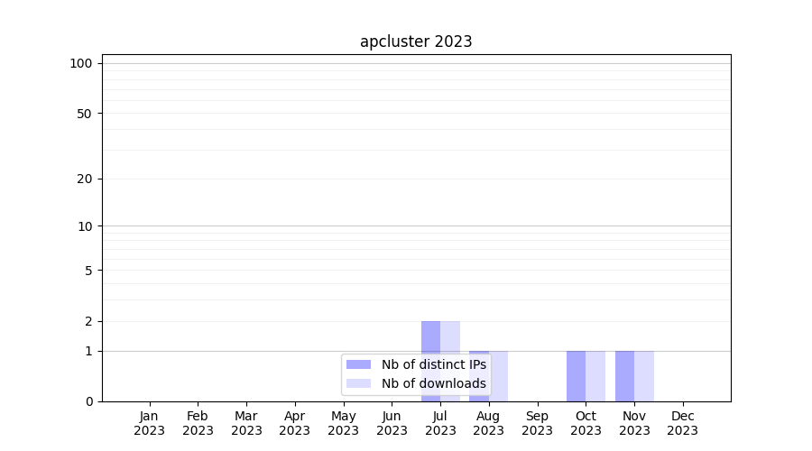 Number of downloads for annotation package apcluster, year by year, from 2025 back to 2014 (years with no downloads are omitted):