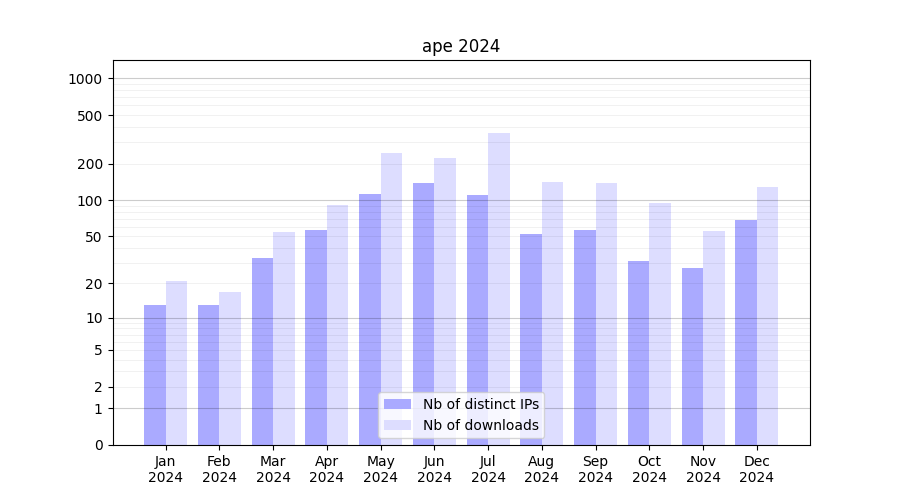 Number of downloads for annotation package ape, year by year, from 2025 back to 2014 (years with no downloads are omitted):