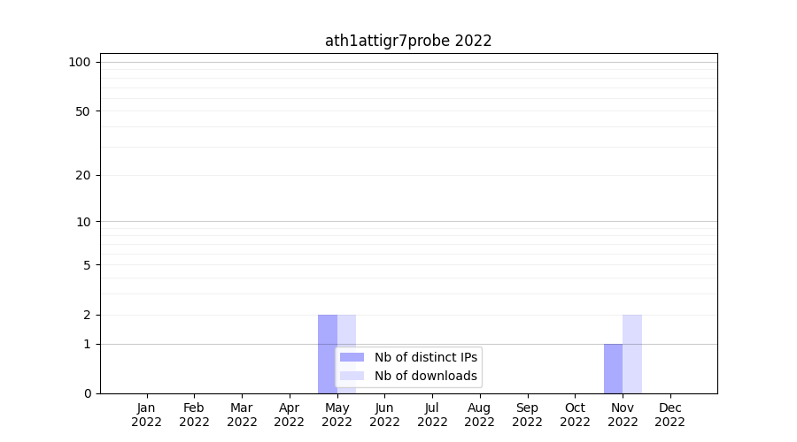 Number of downloads for annotation package ath1attigr7probe, year by year, from 2025 back to 2014 (years with no downloads are omitted):