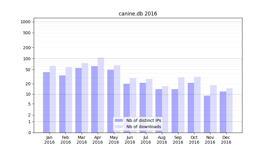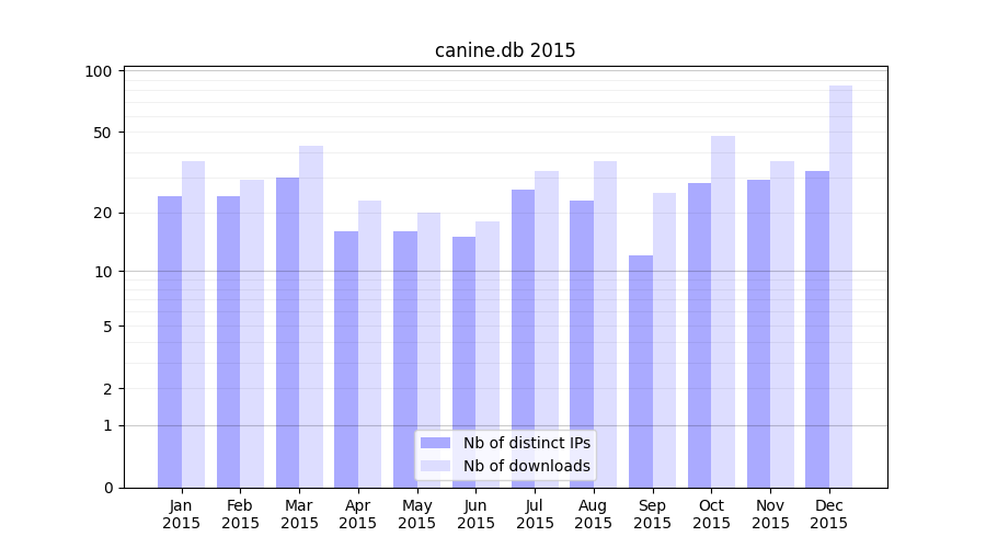 Number of downloads for annotation package canine.db, year by year, from 2025 back to 2014 (years with no downloads are omitted):