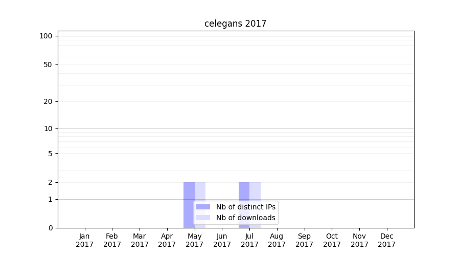 Number of downloads for annotation package celegans, year by year, from 2025 back to 2014 (years with no downloads are omitted):