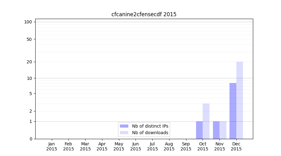 Number of downloads for annotation package cfcanine2cfensecdf, year by year, from 2025 back to 2014 (years with no downloads are omitted):