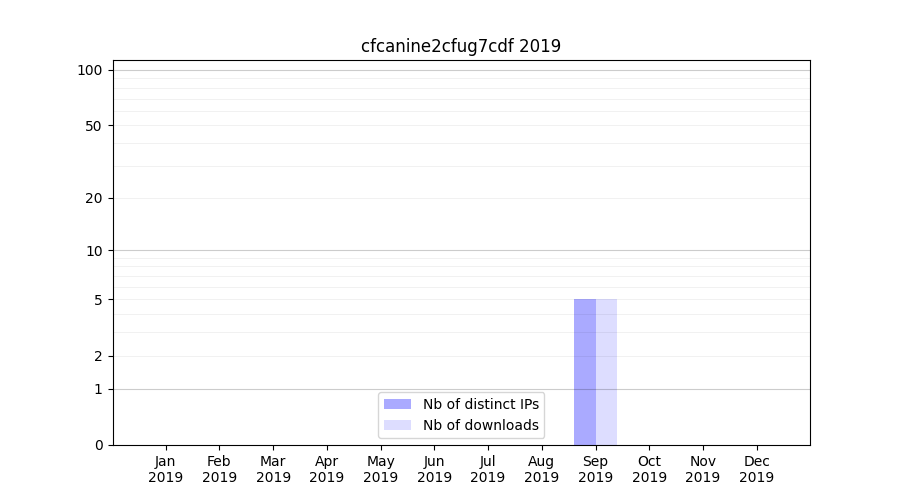 Number of downloads for annotation package cfcanine2cfug7cdf, year by year, from 2025 back to 2014 (years with no downloads are omitted):