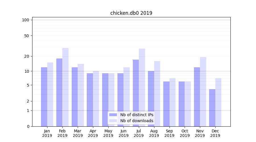 Number of downloads for annotation package chicken.db0, year by year, from 2025 back to 2014 (years with no downloads are omitted):