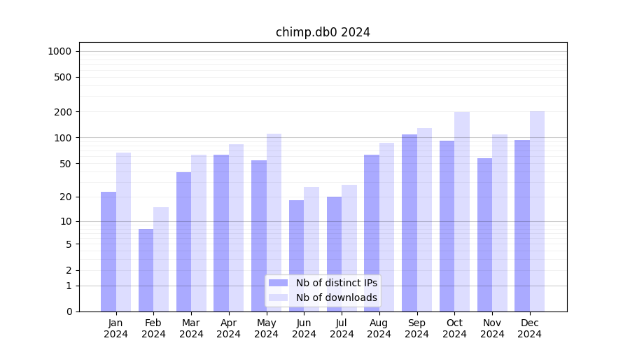Number of downloads for annotation package chimp.db0, year by year, from 2025 back to 2014 (years with no downloads are omitted):