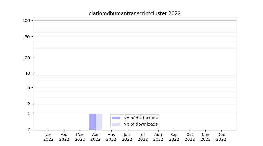 Number of downloads for annotation package clariomdhumantranscriptcluster, year by year, from 2025 back to 2014 (years with no downloads are omitted):