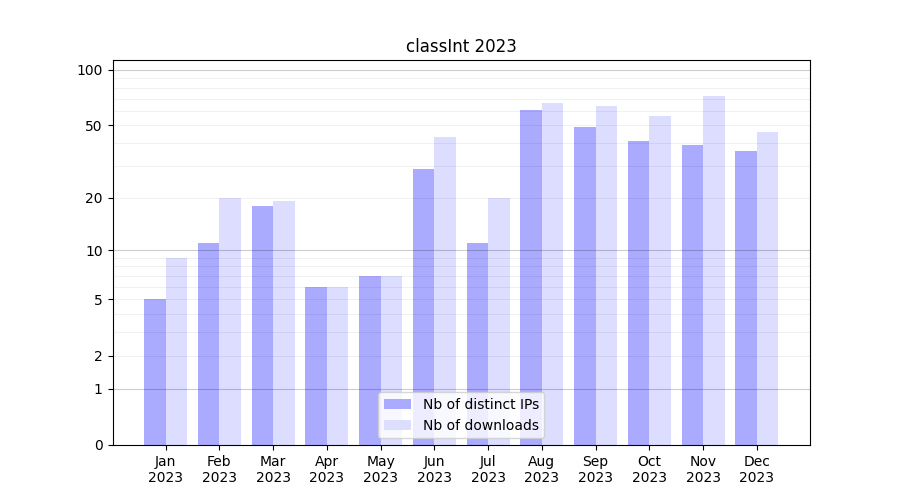 Number of downloads for annotation package classInt, year by year, from 2025 back to 2014 (years with no downloads are omitted):