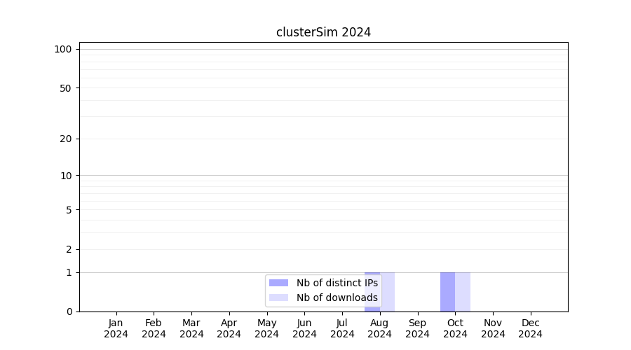 Number of downloads for annotation package clusterSim, year by year, from 2025 back to 2014 (years with no downloads are omitted):