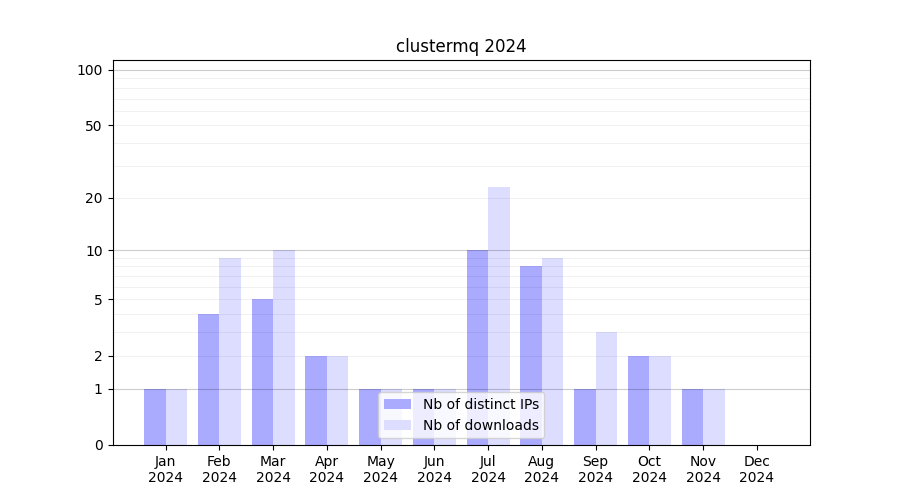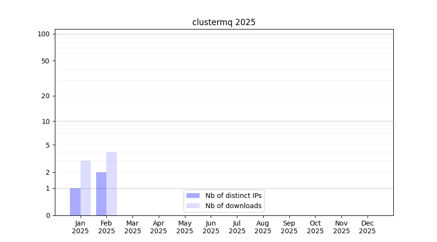 Number of downloads for annotation package clustermq, year by year, from 2025 back to 2014 (years with no downloads are omitted):