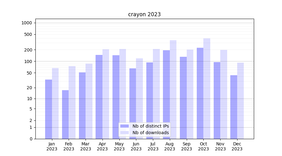 Number of downloads for annotation package crayon, year by year, from 2025 back to 2014 (years with no downloads are omitted):