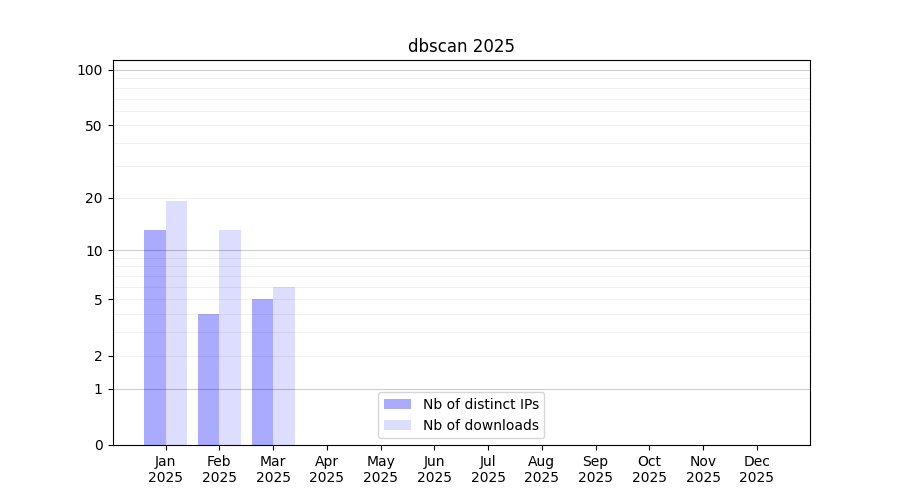Number of downloads for annotation package dbscan, year by year, from 2025 back to 2014 (years with no downloads are omitted):