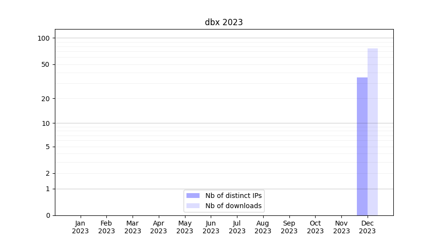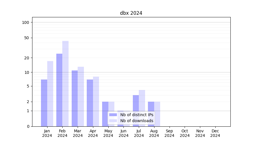 Number of downloads for annotation package dbx, year by year, from 2025 back to 2014 (years with no downloads are omitted):