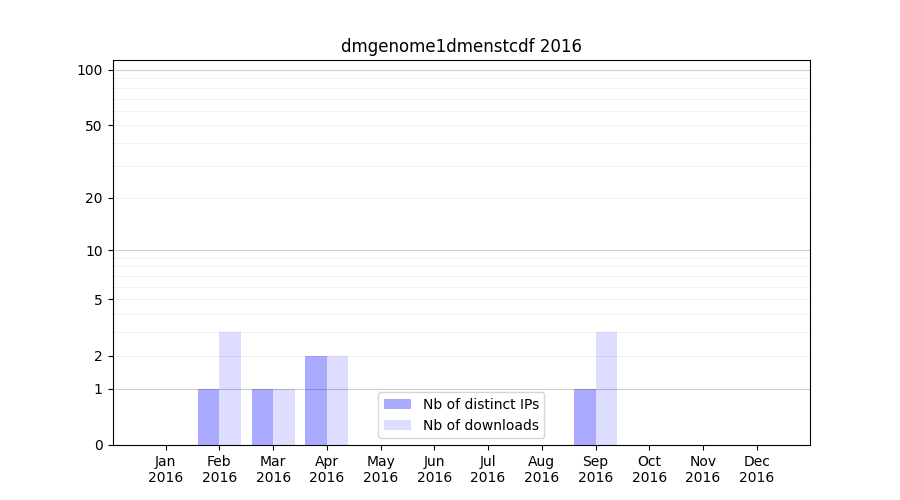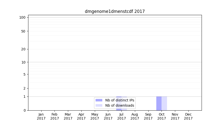 Number of downloads for annotation package dmgenome1dmenstcdf, year by year, from 2025 back to 2014 (years with no downloads are omitted):