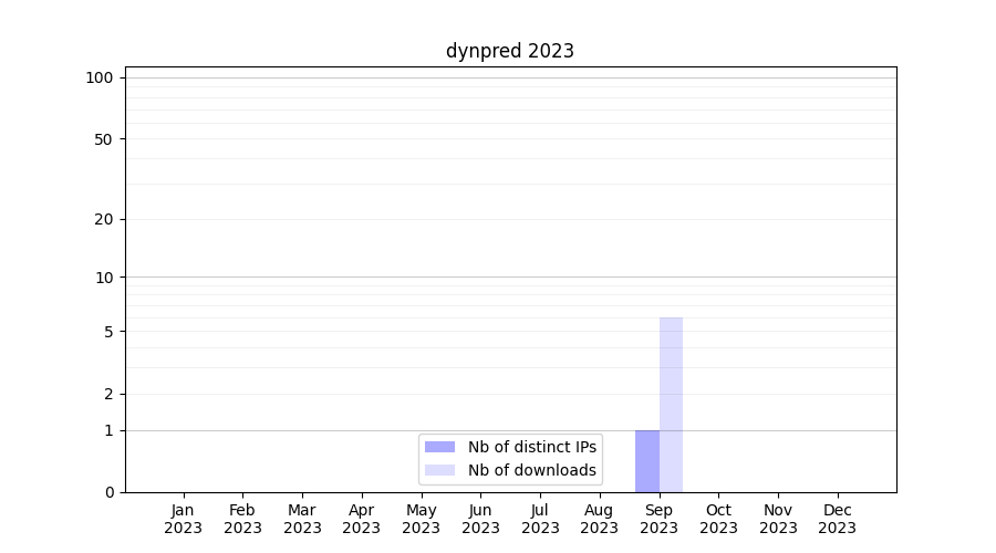Number of downloads for annotation package dynpred, year by year, from 2025 back to 2014 (years with no downloads are omitted):