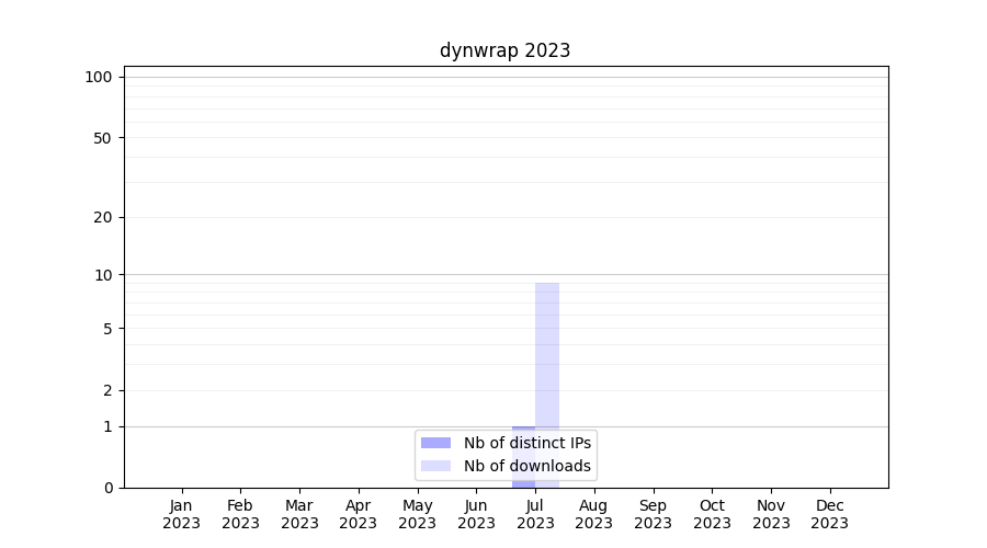 Number of downloads for annotation package dynwrap, year by year, from 2025 back to 2014 (years with no downloads are omitted):