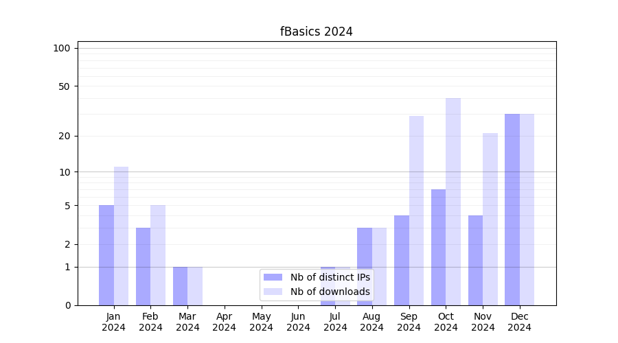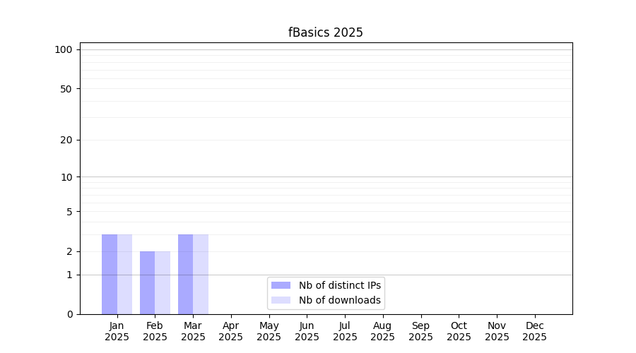 Number of downloads for annotation package fBasics, year by year, from 2025 back to 2014 (years with no downloads are omitted):