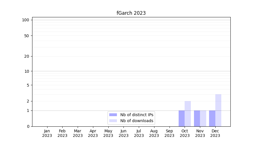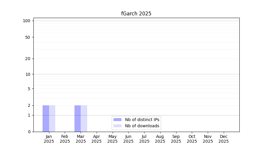Number of downloads for annotation package fGarch, year by year, from 2025 back to 2014 (years with no downloads are omitted):
