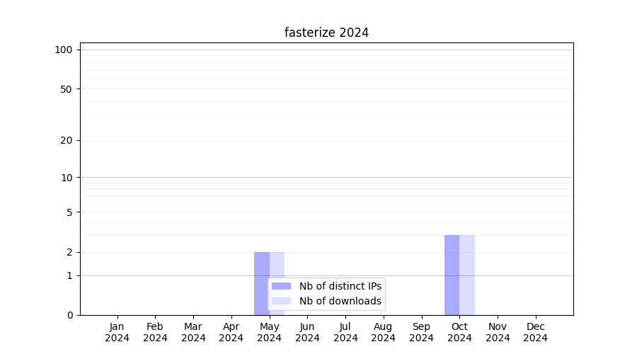Number of downloads for annotation package fasterize, year by year, from 2025 back to 2014 (years with no downloads are omitted):