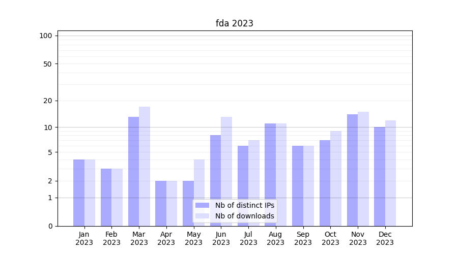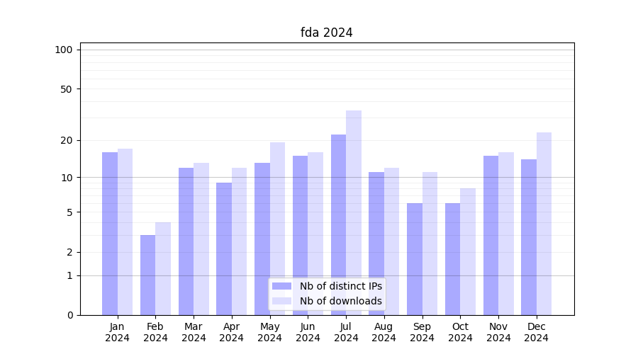 Number of downloads for annotation package fda, year by year, from 2025 back to 2014 (years with no downloads are omitted):
