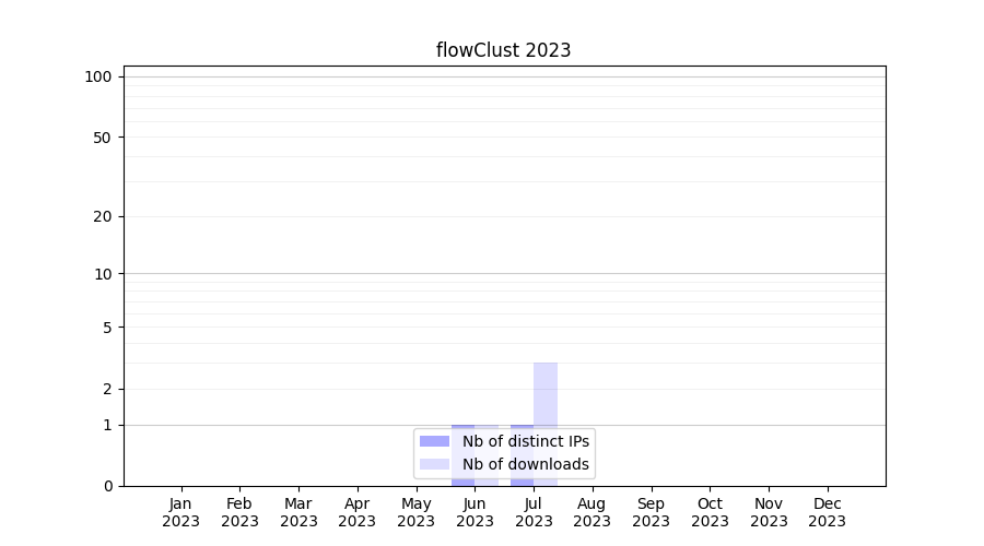 Number of downloads for annotation package flowClust, year by year, from 2025 back to 2014 (years with no downloads are omitted):