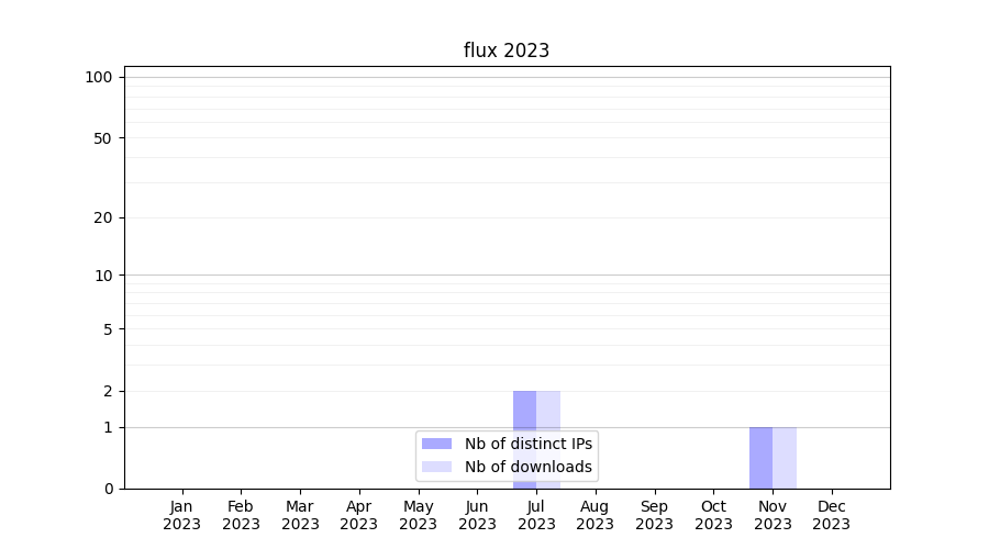 Number of downloads for annotation package flux, year by year, from 2025 back to 2014 (years with no downloads are omitted):