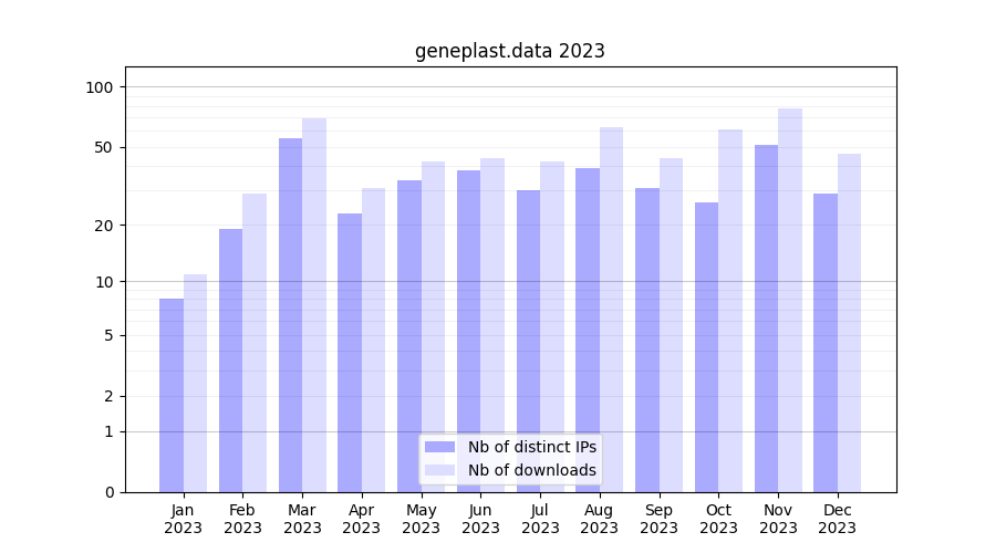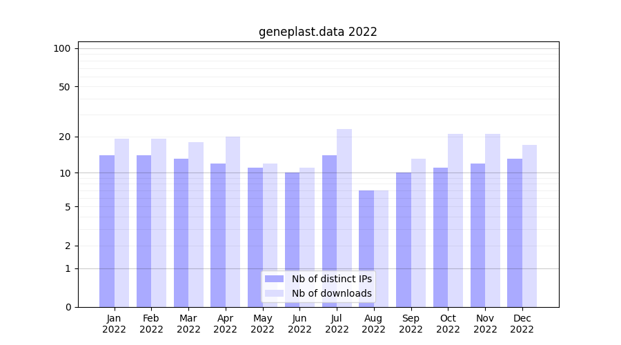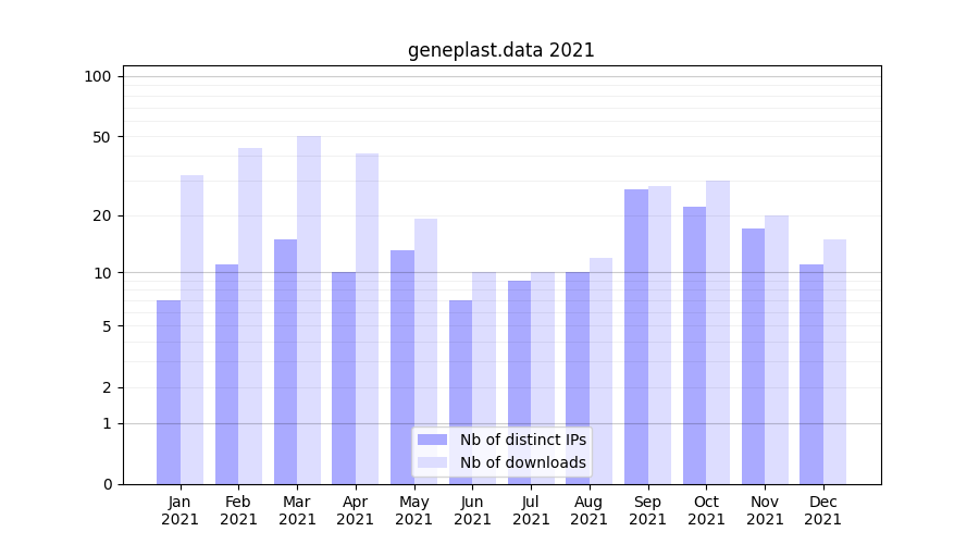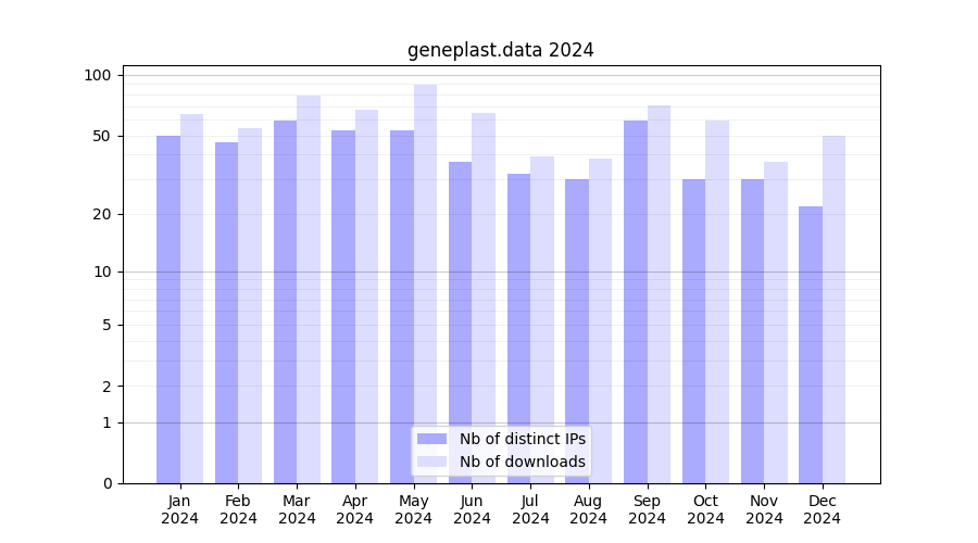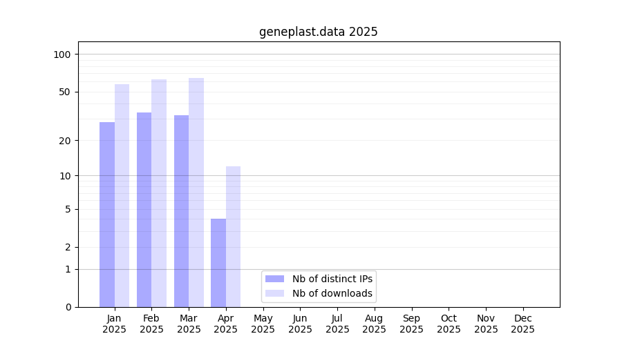 Number of downloads for annotation package geneplast.data, year by year, from 2025 back to 2014 (years with no downloads are omitted):