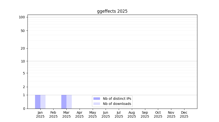 Number of downloads for annotation package ggeffects, year by year, from 2025 back to 2014 (years with no downloads are omitted):