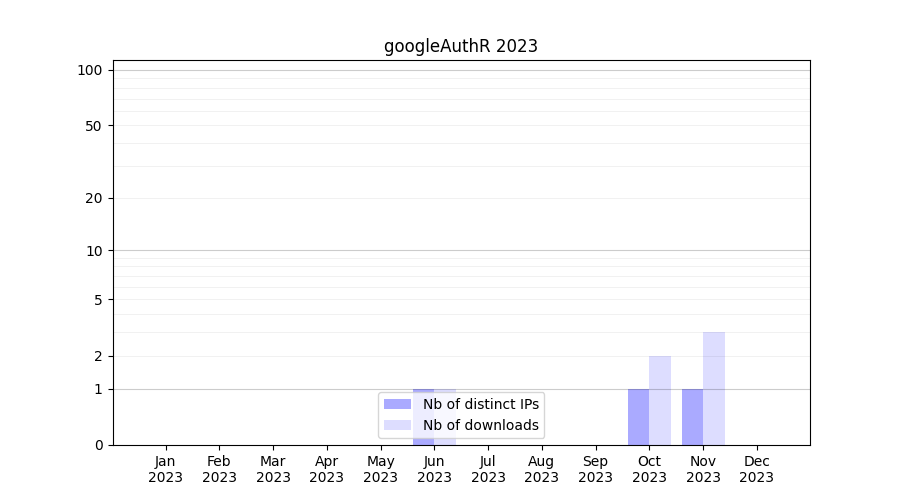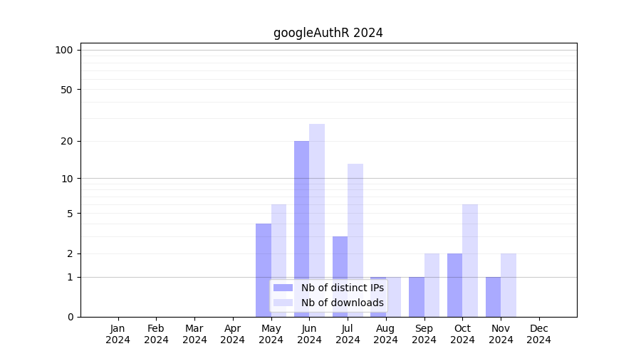 Number of downloads for annotation package googleAuthR, year by year, from 2025 back to 2014 (years with no downloads are omitted):