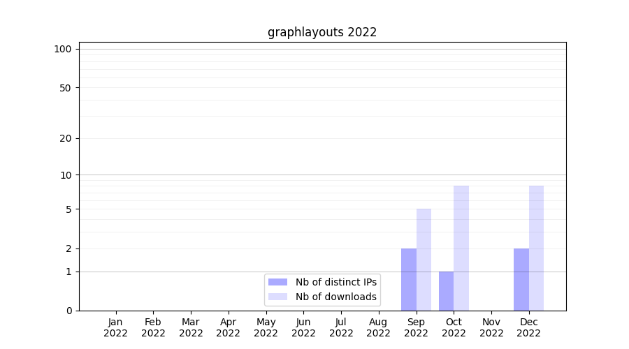 Number of downloads for annotation package graphlayouts, year by year, from 2025 back to 2014 (years with no downloads are omitted):