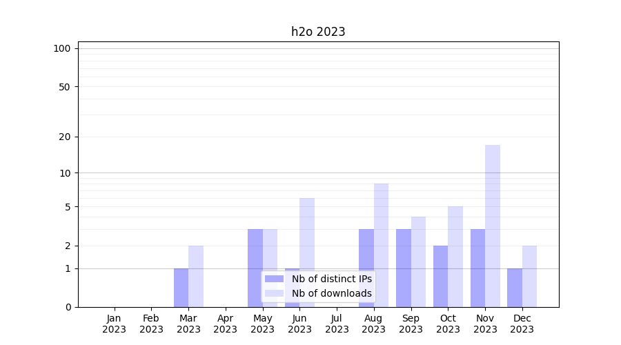 Number of downloads for annotation package h2o, year by year, from 2025 back to 2014 (years with no downloads are omitted):