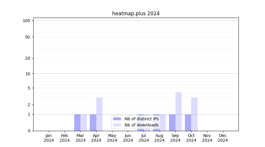 Number of downloads for annotation package heatmap.plus, year by year, from 2025 back to 2014 (years with no downloads are omitted):