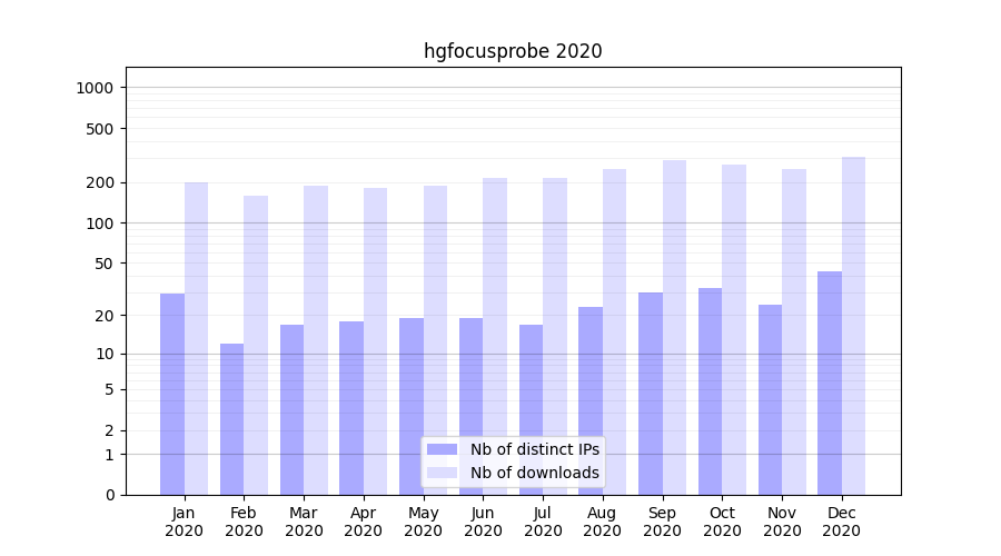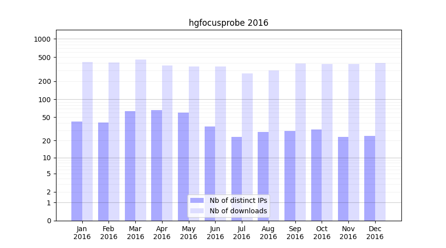 Number of downloads for annotation package hgfocusprobe, year by year, from 2025 back to 2014 (years with no downloads are omitted):