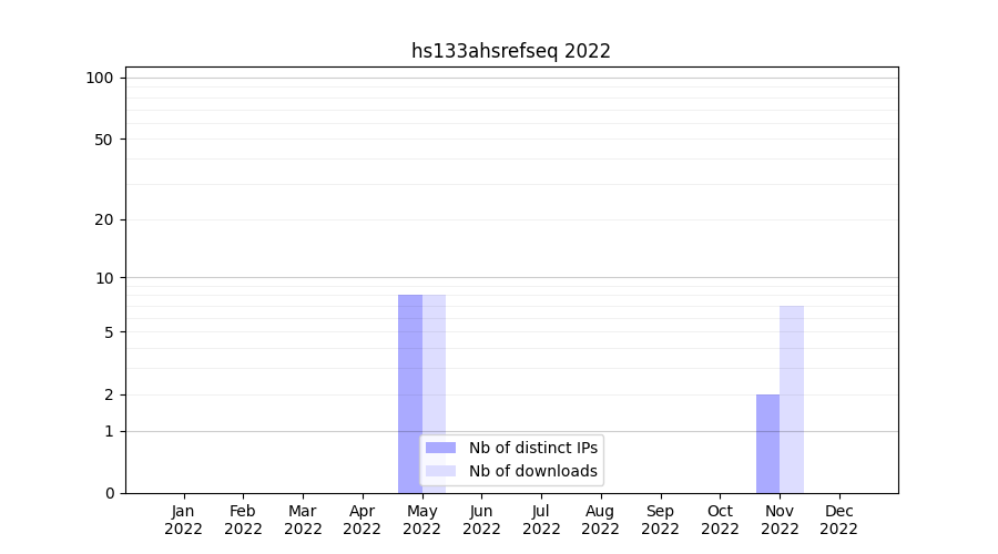 Number of downloads for annotation package hs133ahsrefseq, year by year, from 2025 back to 2014 (years with no downloads are omitted):
