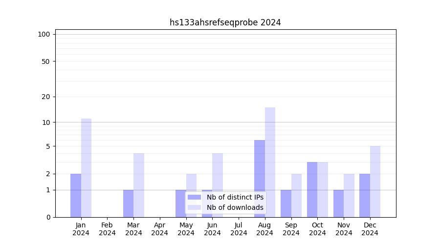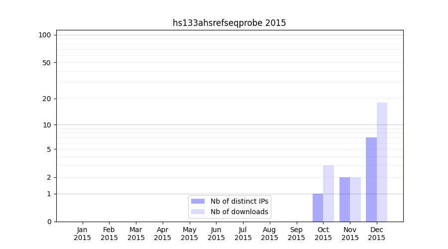 Number of downloads for annotation package hs133ahsrefseqprobe, year by year, from 2025 back to 2014 (years with no downloads are omitted):
