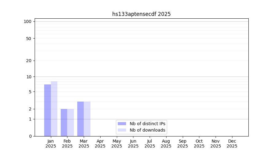 Number of downloads for annotation package hs133aptensecdf, year by year, from 2025 back to 2014 (years with no downloads are omitted):