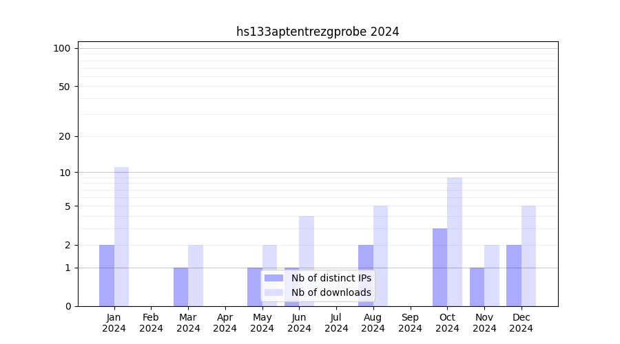 Number of downloads for annotation package hs133aptentrezgprobe, year by year, from 2025 back to 2014 (years with no downloads are omitted):