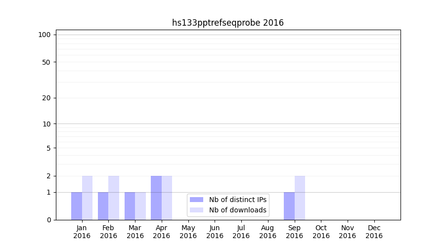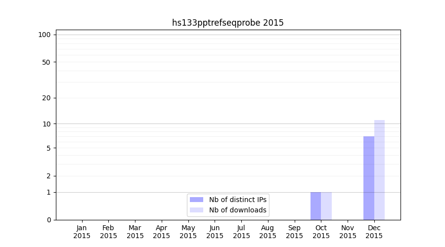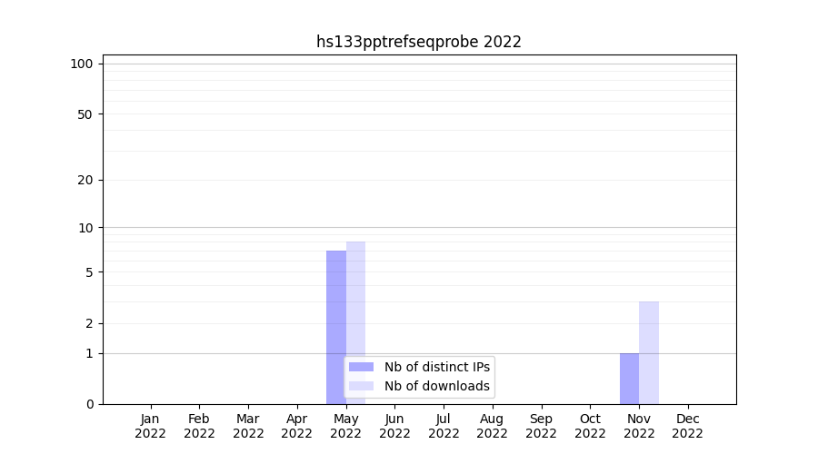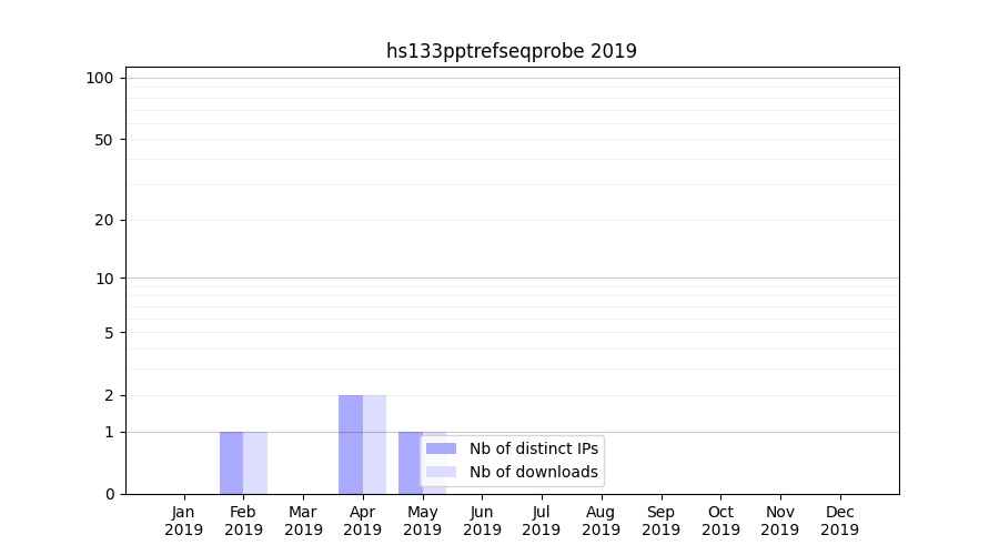 Number of downloads for annotation package hs133pptrefseqprobe, year by year, from 2025 back to 2014 (years with no downloads are omitted):