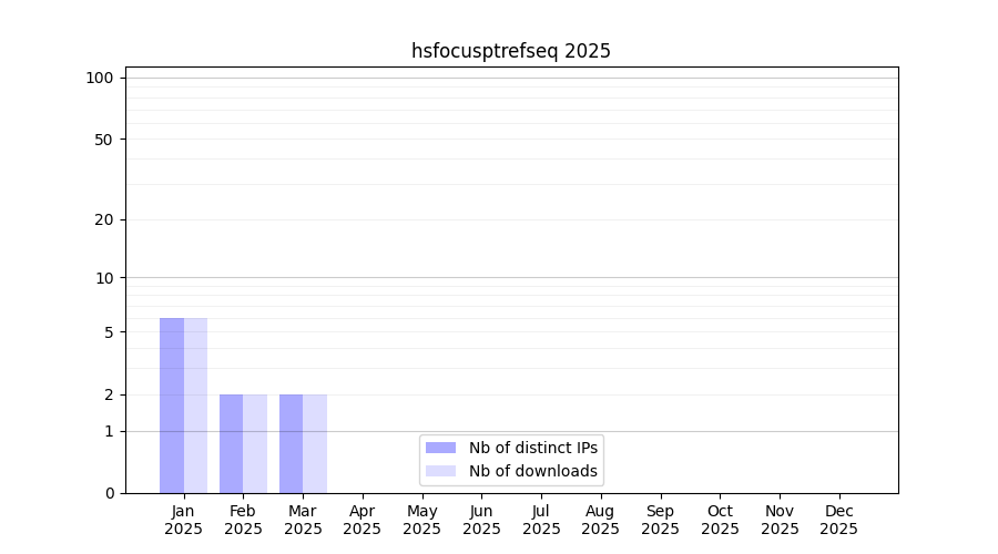 Number of downloads for annotation package hsfocusptrefseq, year by year, from 2025 back to 2014 (years with no downloads are omitted):