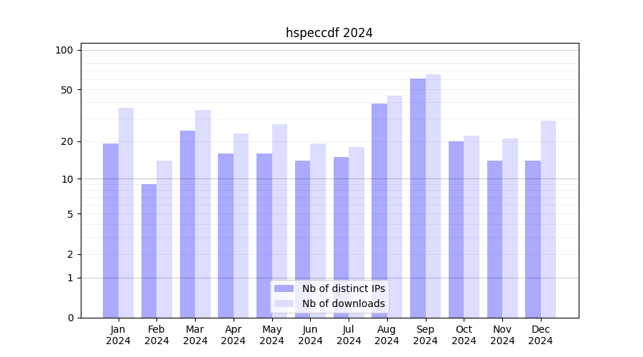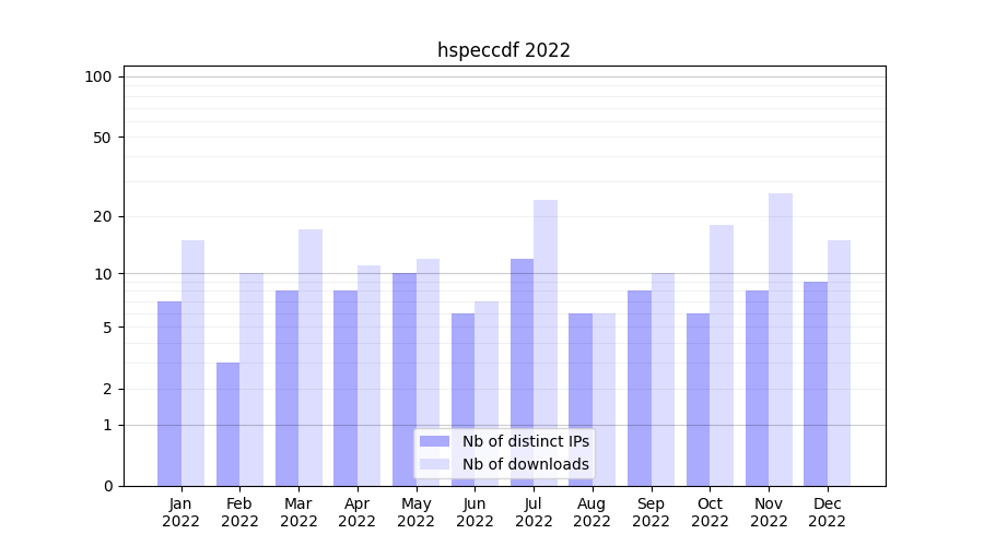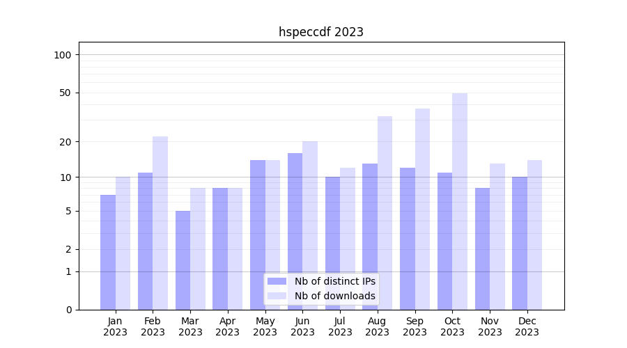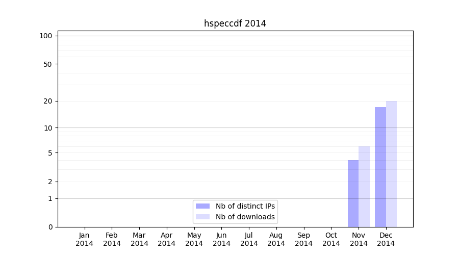 Number of downloads for annotation package hspeccdf, year by year, from 2025 back to 2014 (years with no downloads are omitted):