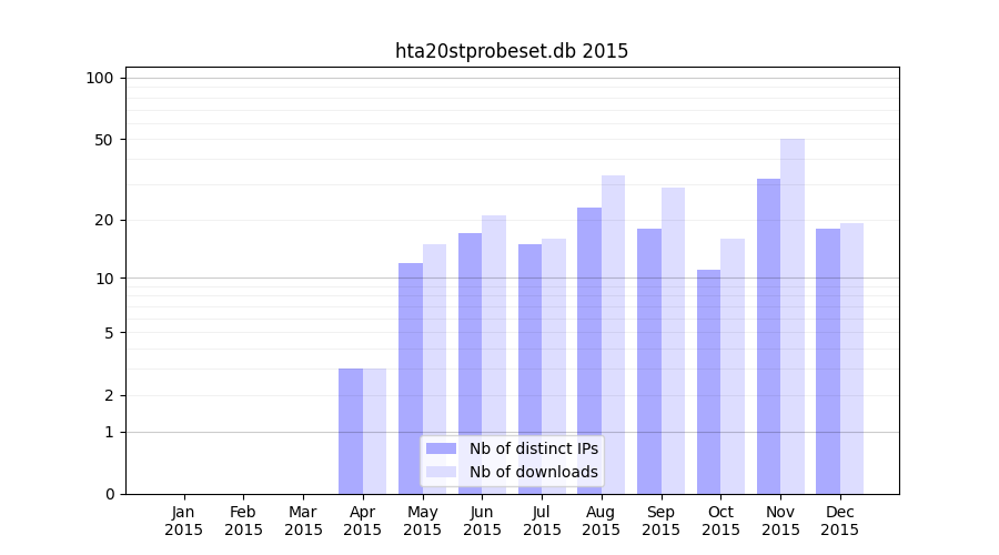 Number of downloads for annotation package hta20stprobeset.db, year by year, from 2025 back to 2014 (years with no downloads are omitted):