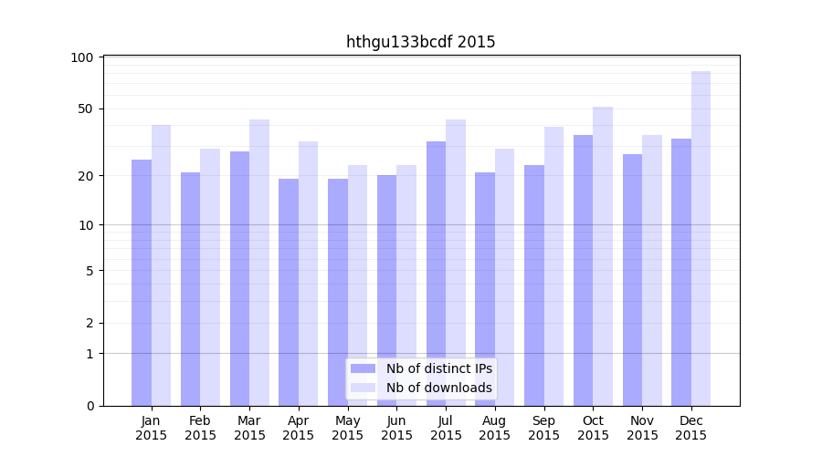 Number of downloads for annotation package hthgu133bcdf, year by year, from 2025 back to 2014 (years with no downloads are omitted):