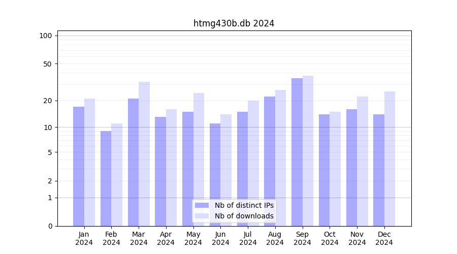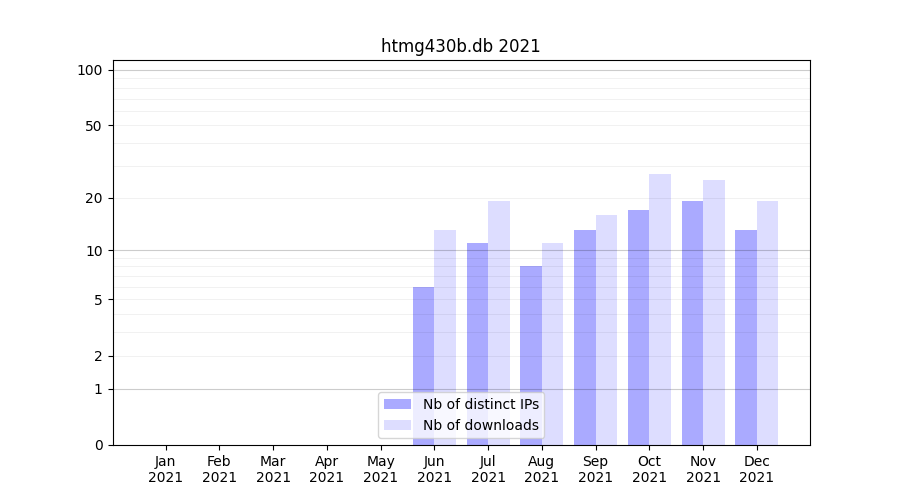 Number of downloads for annotation package htmg430b.db, year by year, from 2025 back to 2014 (years with no downloads are omitted):
