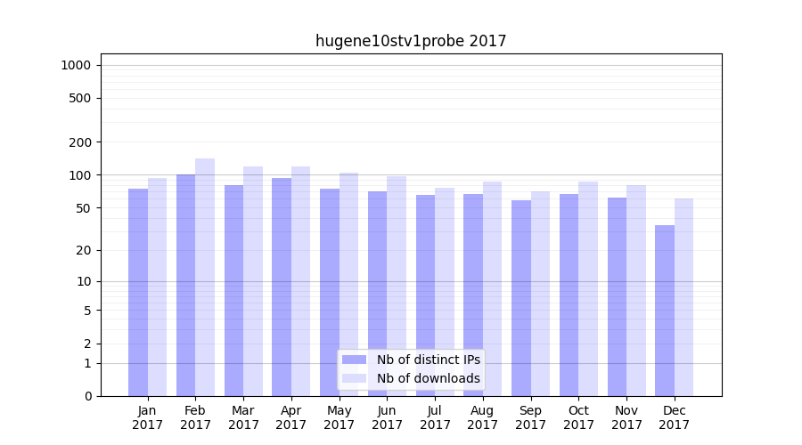 Number of downloads for annotation package hugene10stv1probe, year by year, from 2025 back to 2014 (years with no downloads are omitted):