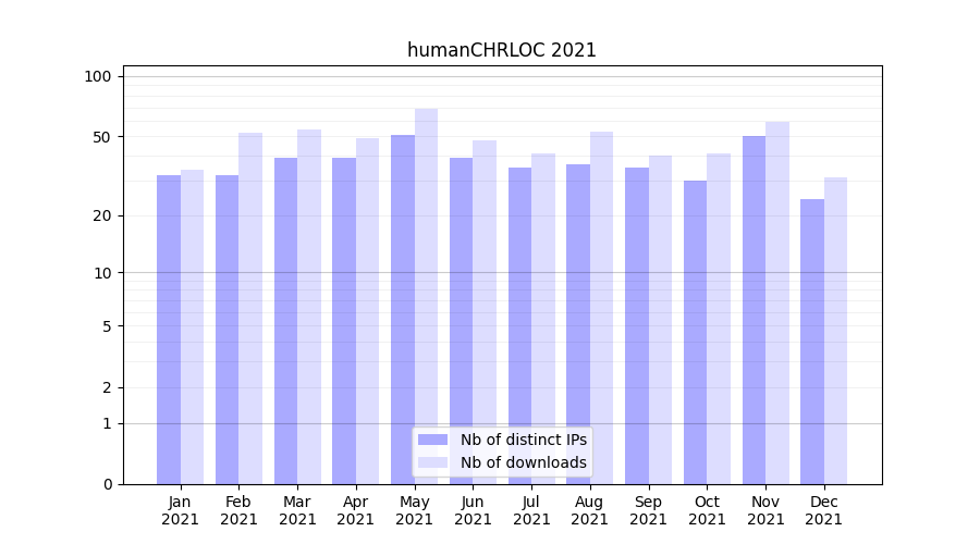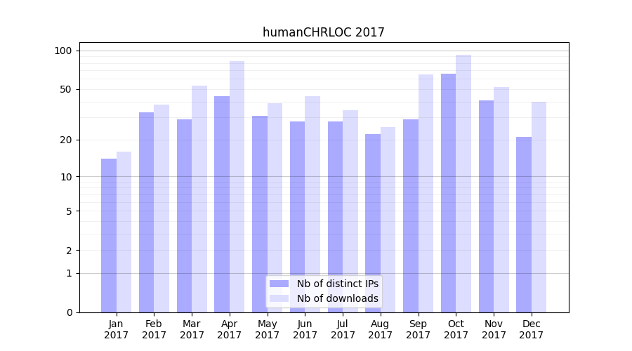 Number of downloads for annotation package humanCHRLOC, year by year, from 2025 back to 2014 (years with no downloads are omitted):