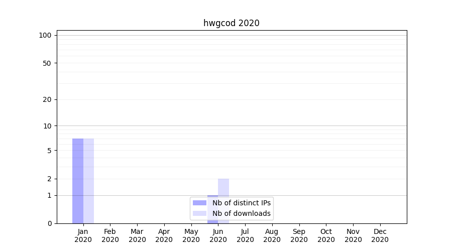Number of downloads for annotation package hwgcod, year by year, from 2025 back to 2014 (years with no downloads are omitted):