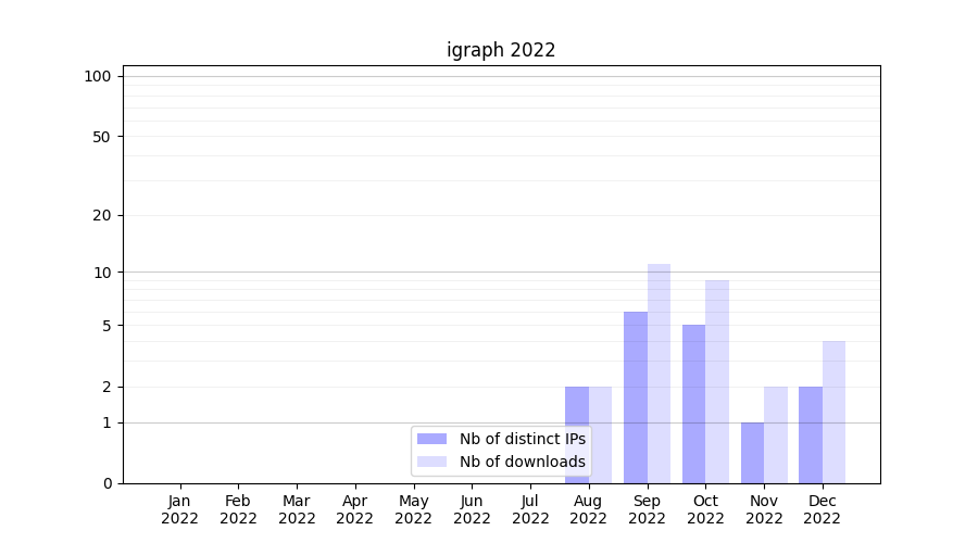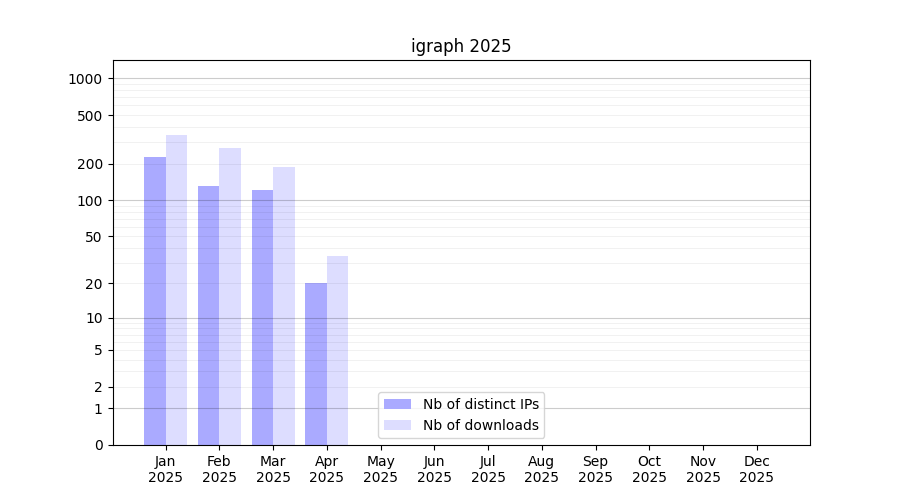 Number of downloads for annotation package igraph, year by year, from 2025 back to 2014 (years with no downloads are omitted):