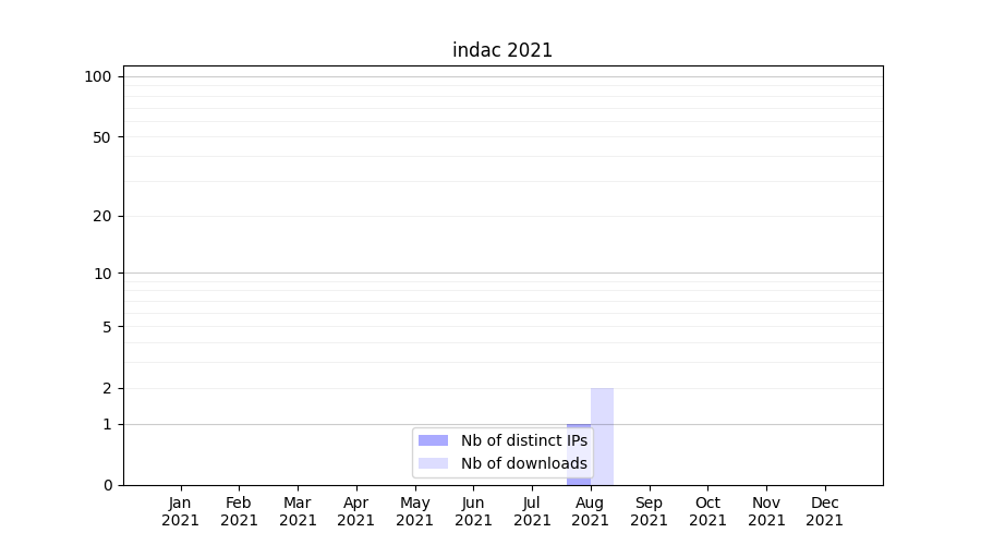 Number of downloads for annotation package indac, year by year, from 2025 back to 2014 (years with no downloads are omitted):